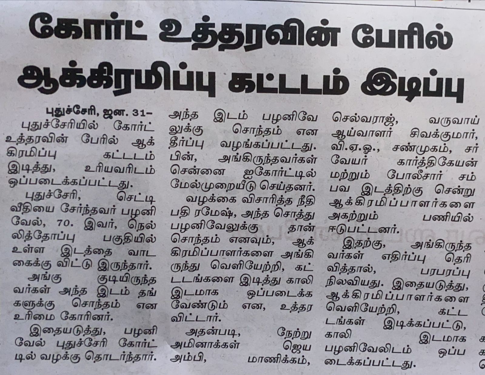 A Pondichéry la démolition d’un immeuble squatté illégalement par les locataires a été ordonnée par le tribunal de Haut-Court.